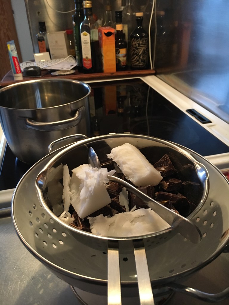 - Smelt sjokoladen og kokosfettet over vannbad, og rør det til en jevn glasur.