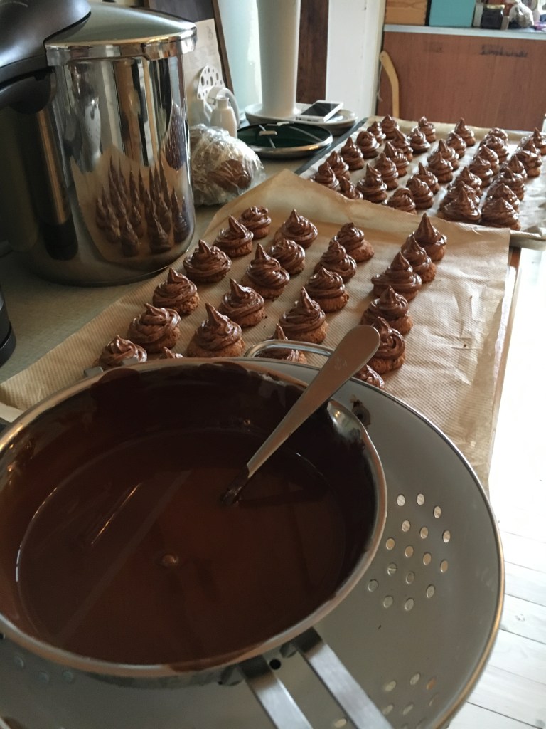 Først i 2012 hadde jeg samlet mot nok til å vurdere å dele eggehviter og å styre med vannbad selv. Nå skulle det bakes, og jeg hadde satt av hele kvelden! Halvveis i oppskriften ble det avslørt at etter «oppkok av fløte og sjokolade» måtte det gå et halvt døgn med avkjøling før ytterligere baking kunne finne sted. Kakene Sarah Bernhardt var tydeligvis minst like krevende som skuespillerinnen de er oppkalt etter. Dag 2 gikk noe i krøll med kremens konsistens, og da den var vel sprøytet på hver sin bunn så det bare ut som en velorganisert hund hadde lagt igjen 30 små turds på kjøkkenbenken. Turds som i tillegg krevde å bruke tid på å stå kjølig til de var stivnet. Omtrent da mistet jeg motet, og turdsene fikk aldri sjokoladetrekket sitt.