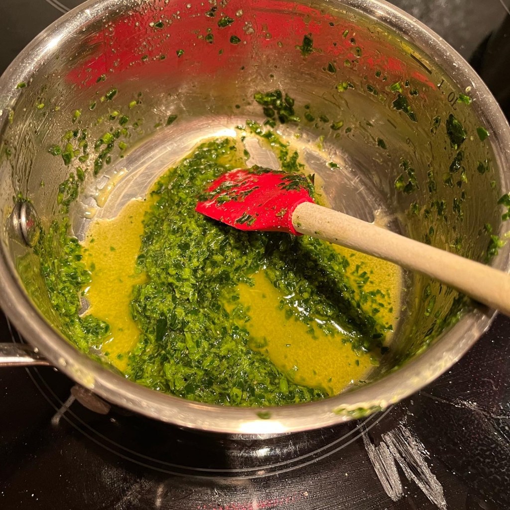 - Ha persillepuréen i en kjele, varm opp og rør inn 2 ss smør. Smak til med salt og pepper