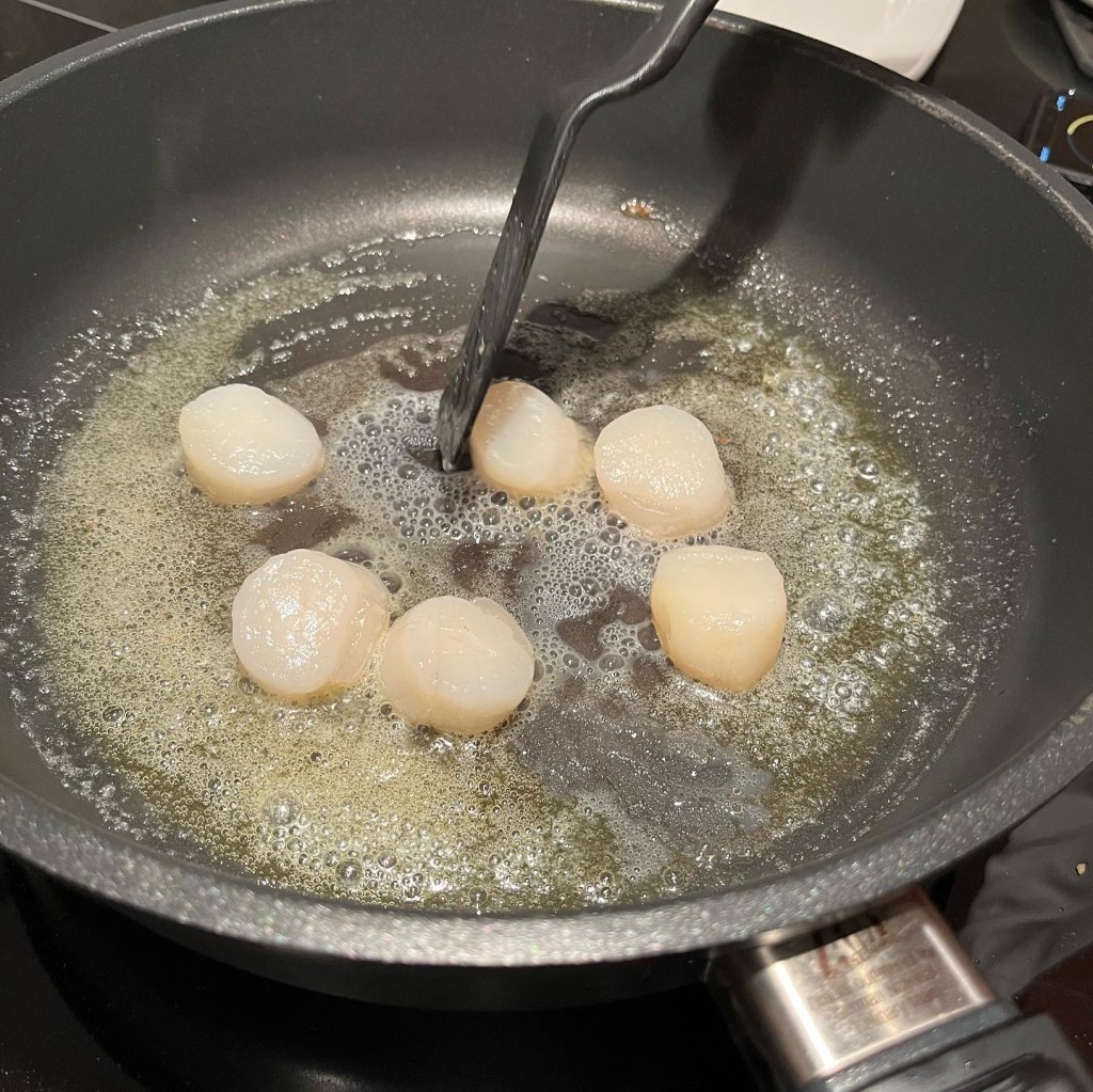 - Krydre kamskjellene med salt og pepper, og stek i 1 ss smør i 30-60 sekunder på hver side slik at de blir brune og fine.