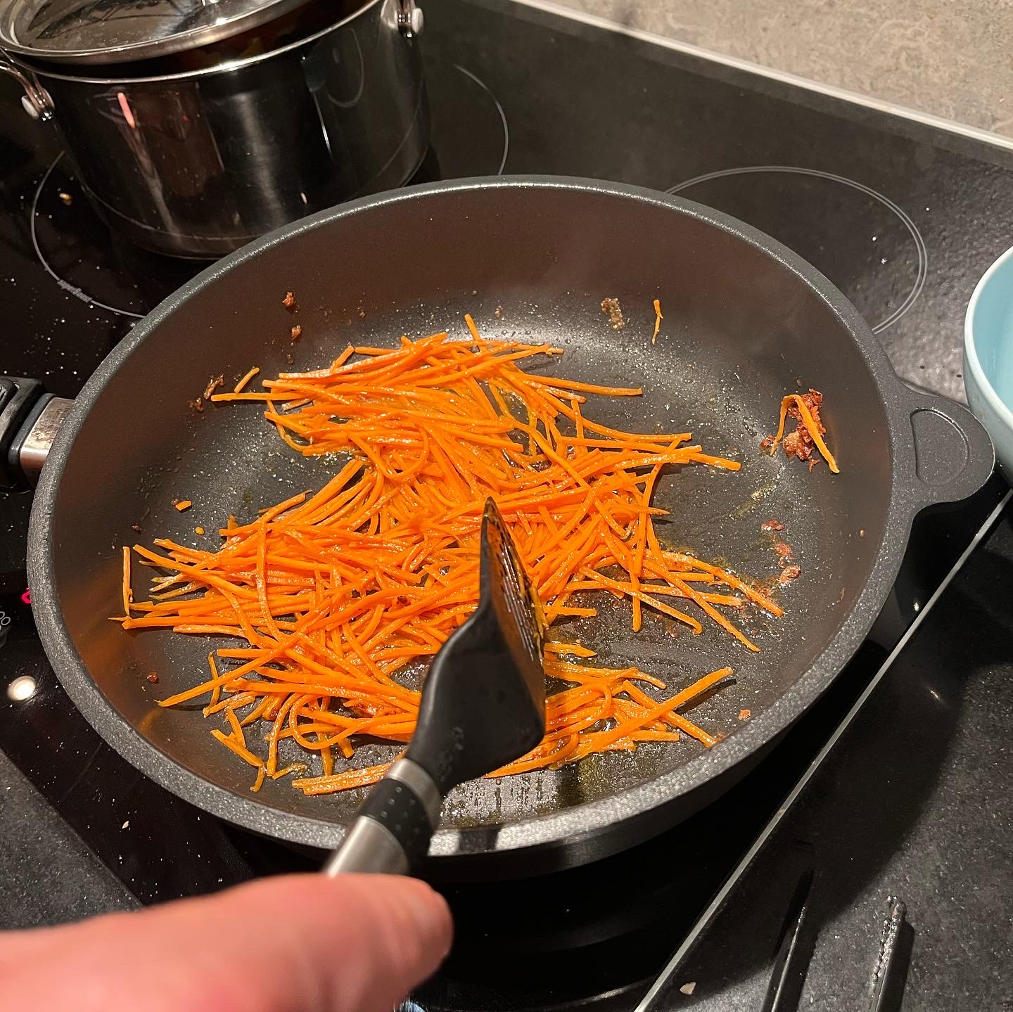 - 1/2 gulrot i strimler. Vi brukte mandolin med den mellomste strimleren på