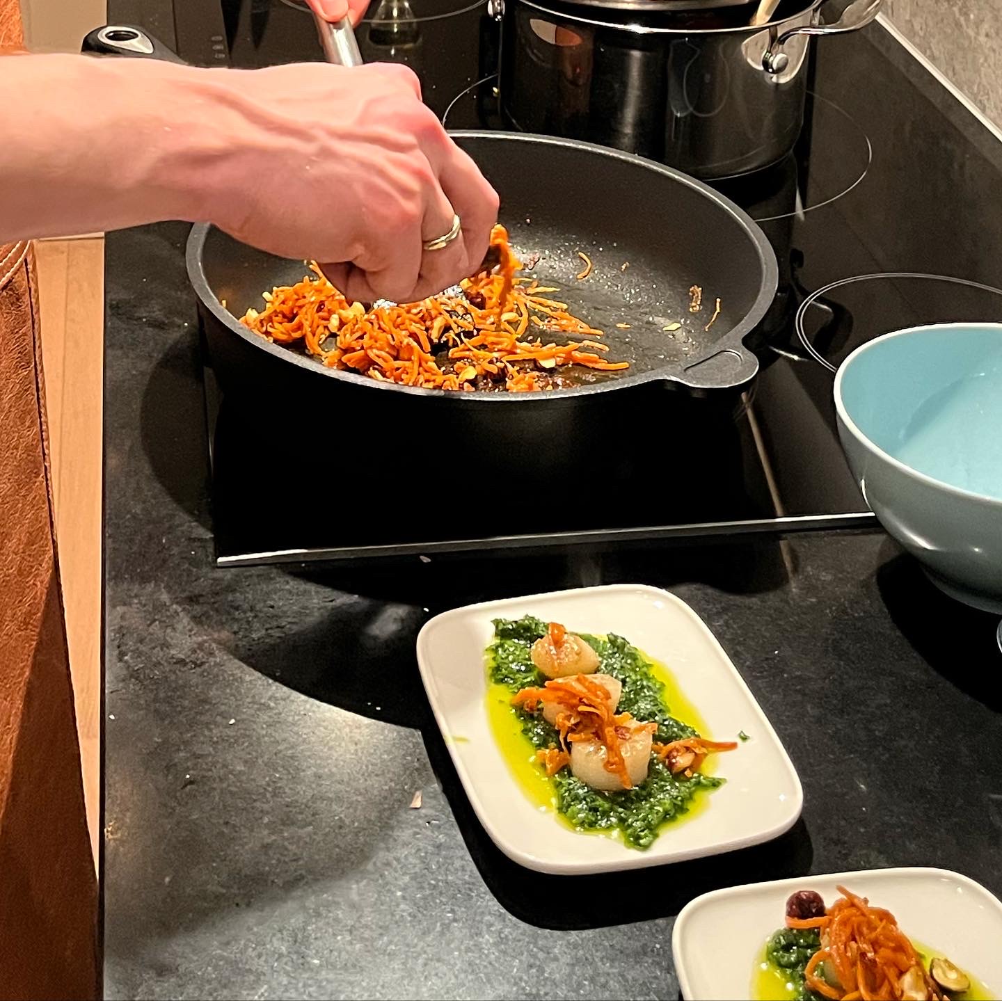 - Anrett persillesausen som et speil på tallerkenen, legg kamskjell oppå og fordel gulrotsalaten på toppen
