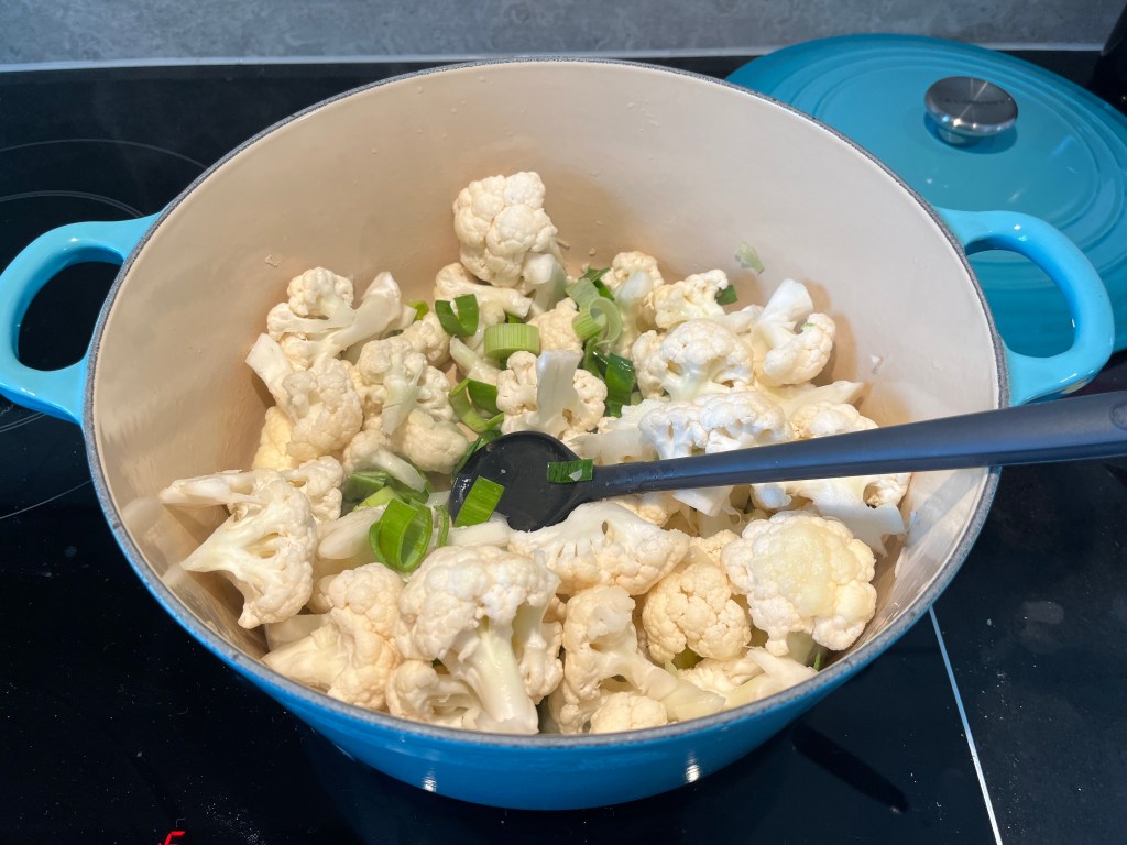 - Fres blomkålbukettene som skal i suppen og blomkålstilkbitene i smør (naturligvis) med 2 fedd finhakket hvitløk og en halv purre delt i grove biter