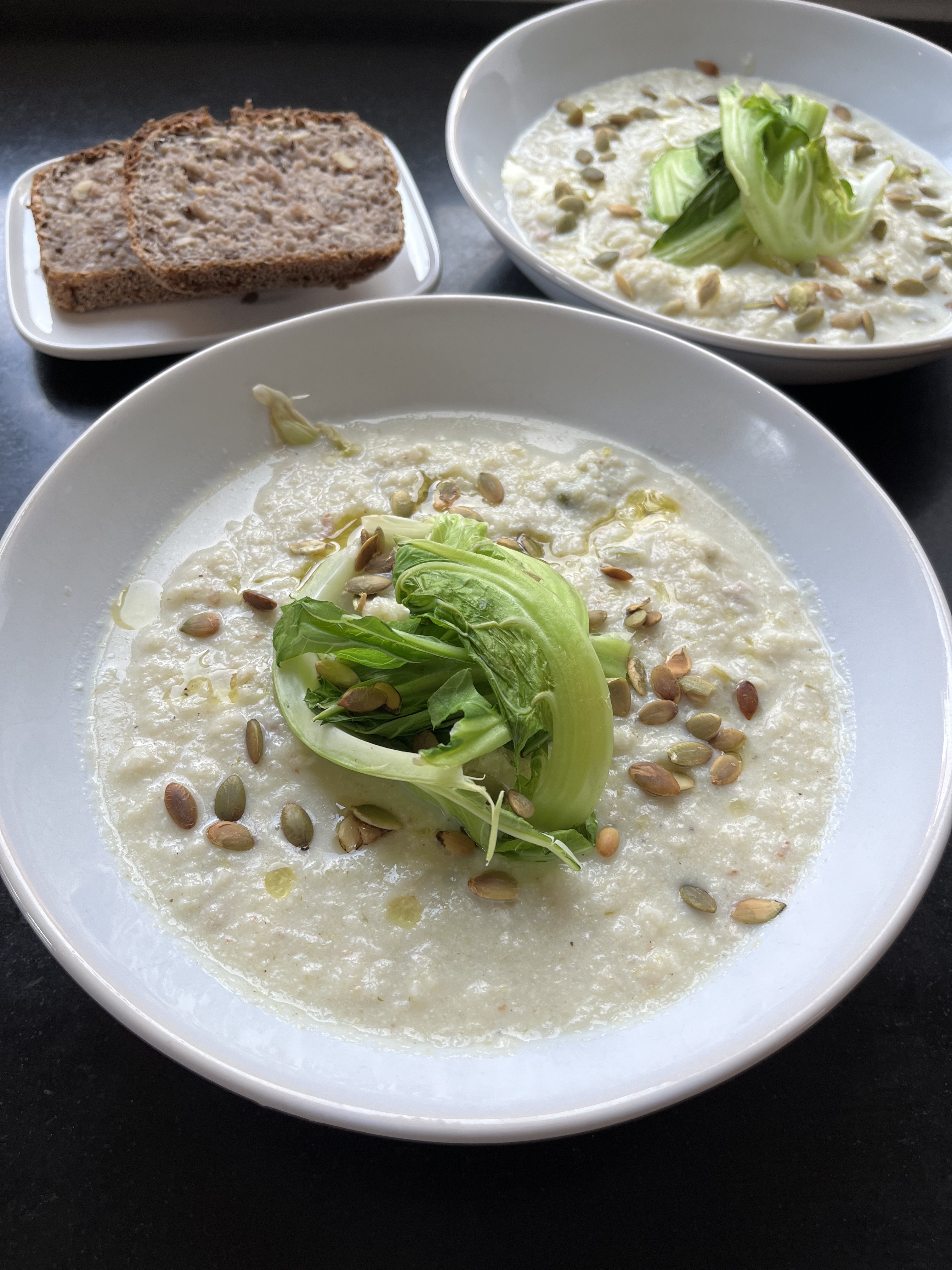 Server med en god olivenolje klunket restaurantaktig over, pluss toppingen med stekte blader, gresskarkjerner og hele blomkålbuketter, og rist noen brødskiver.