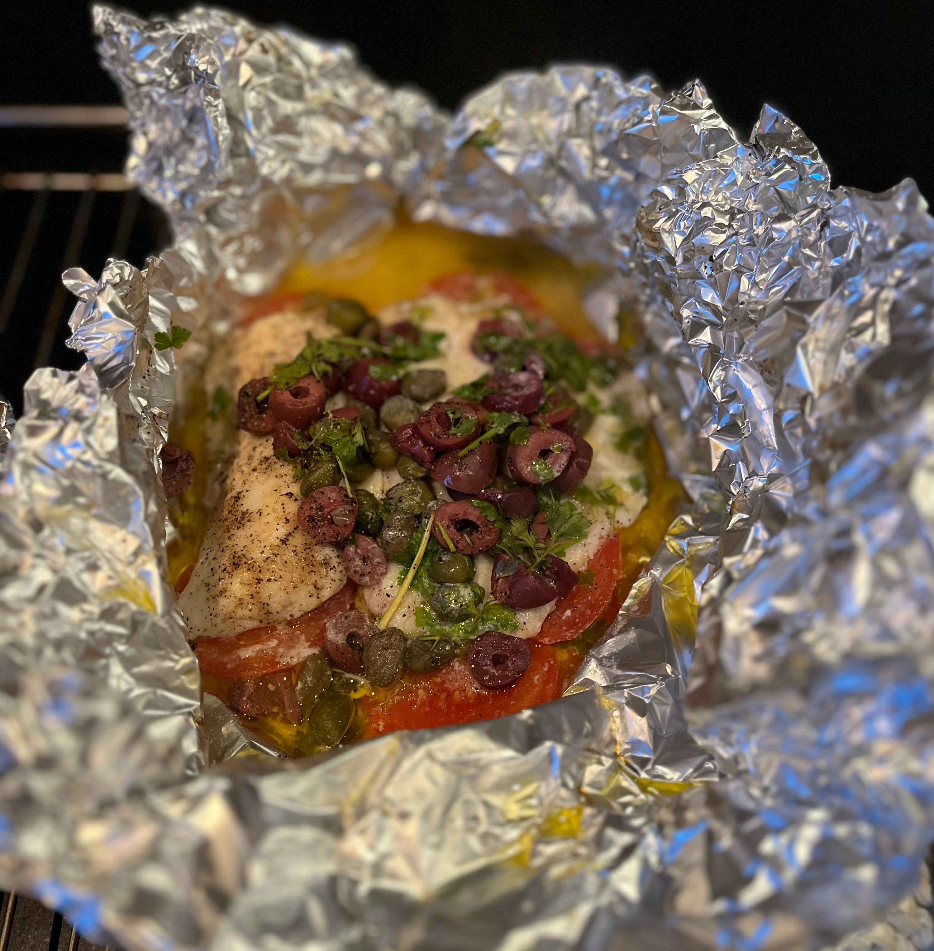 Til servering er det bare å la tomatene og sausen skli ut av aluminiumsfolien med alt det gode oppå.