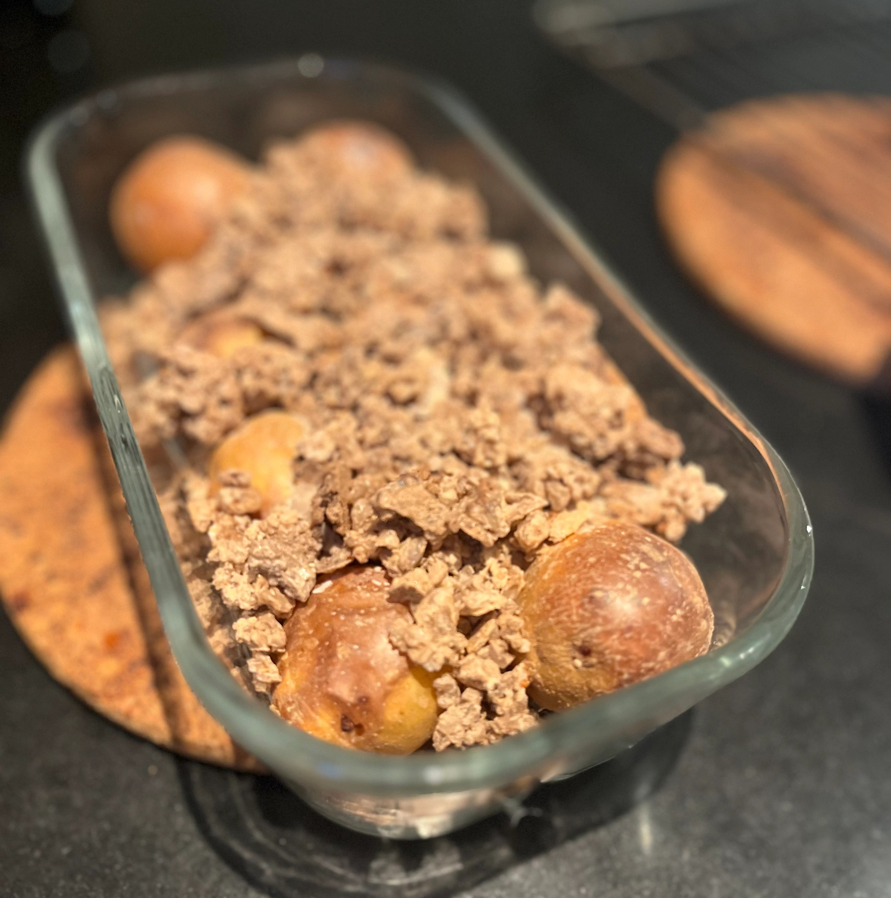 - Ha potetene i en ildfast form og hell over saltet. Saltet trenger ikke å dekke potetene, men alle potetene må være inntil salt.