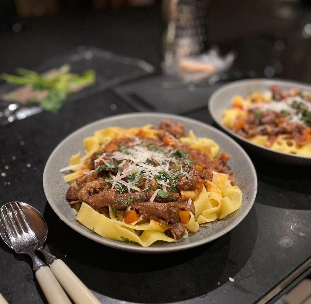 - Hell av kokevannet og bland pastaen med oksehaleraguen – eller server det hver for seg.