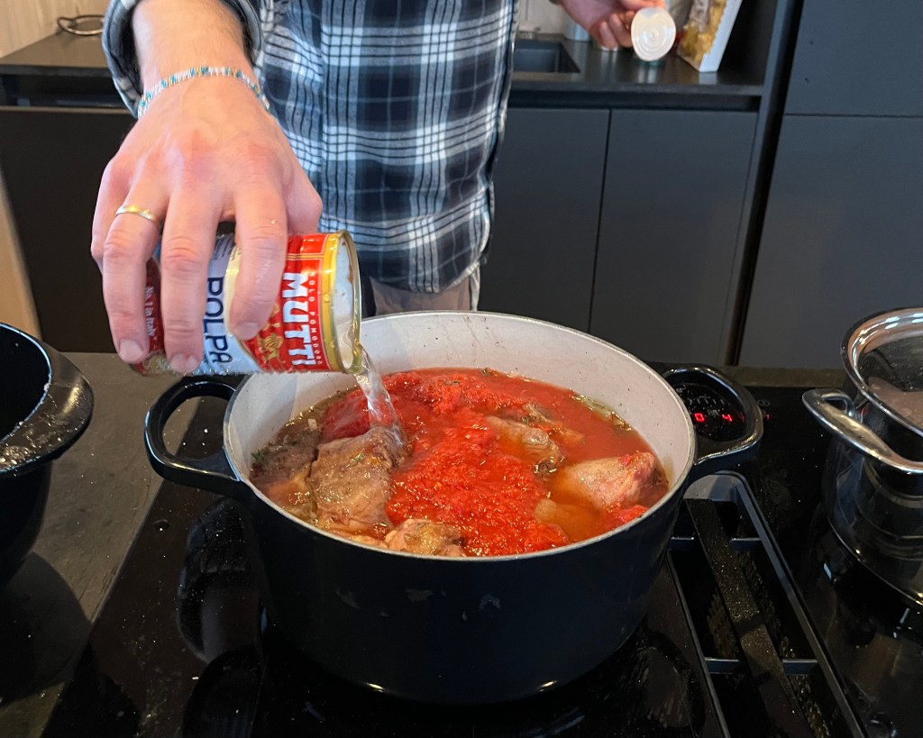 - Legg oksehalene tilbake igjen. Tilsett knuste tomater, laurbær og rødvin. Fyll opp med vann til det så vidt dekker halene. La det hele få et oppkok på platen.