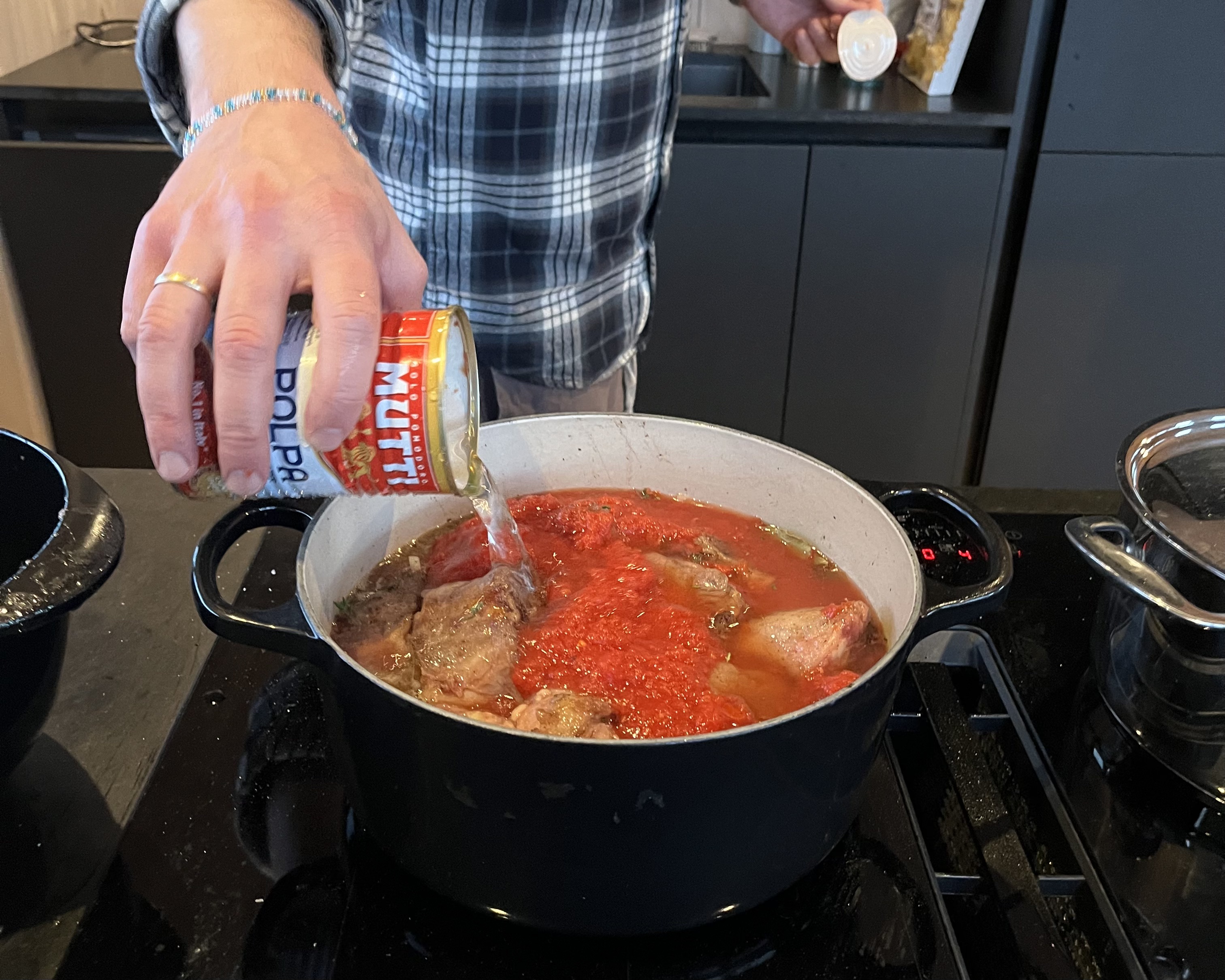 - Legg oksehalene tilbake igjen. Tilsett knuste tomater, laurbær og rødvin. Fyll opp med vann til det så vidt dekker halene. La det hele få et oppkok på platen.