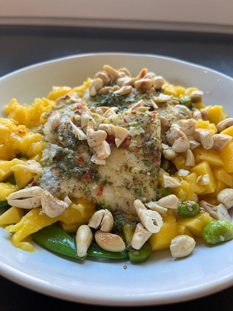 - Når alt er klart, ha ris eller nudler nederst, deretter grønnsaker og legg torsken oppå. Ha resten av sausen, de ristede nøttene, finsnittet vårløk og grovhakket koriander på toppen