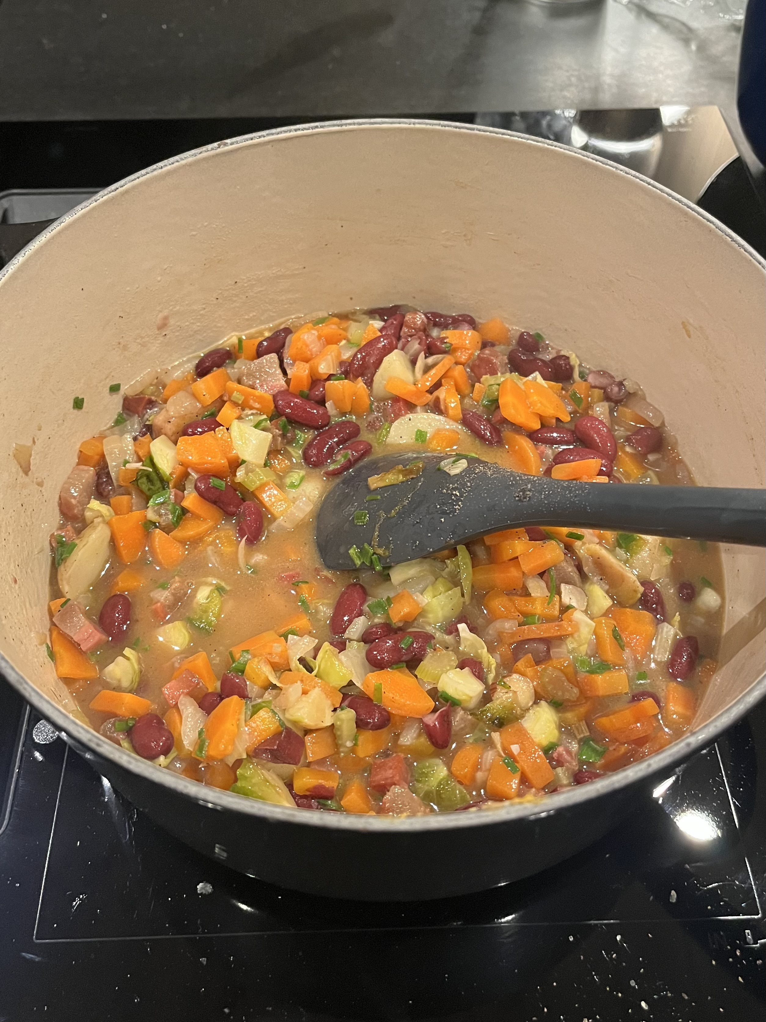 Det kule med at sausen smaker så mye og så godt, er at gryten fint tåler å få oppi litt tilfeldige rester. For tre dager siden ble det en kvart blomkål, kuttet i passe store biter. I dag ble det to kokte poteter og en rosenkålsalatslant fra gårsdagens middag. I tillegg til at kjøleskapet blir ryddigere, får man kanskje en morsom oppdagelse. I rosenkålsalaten var det litt ristede hasselnøtter som funket veldig bra i gryta, men det ville jeg aldri kommet på å ha oppi ellers.