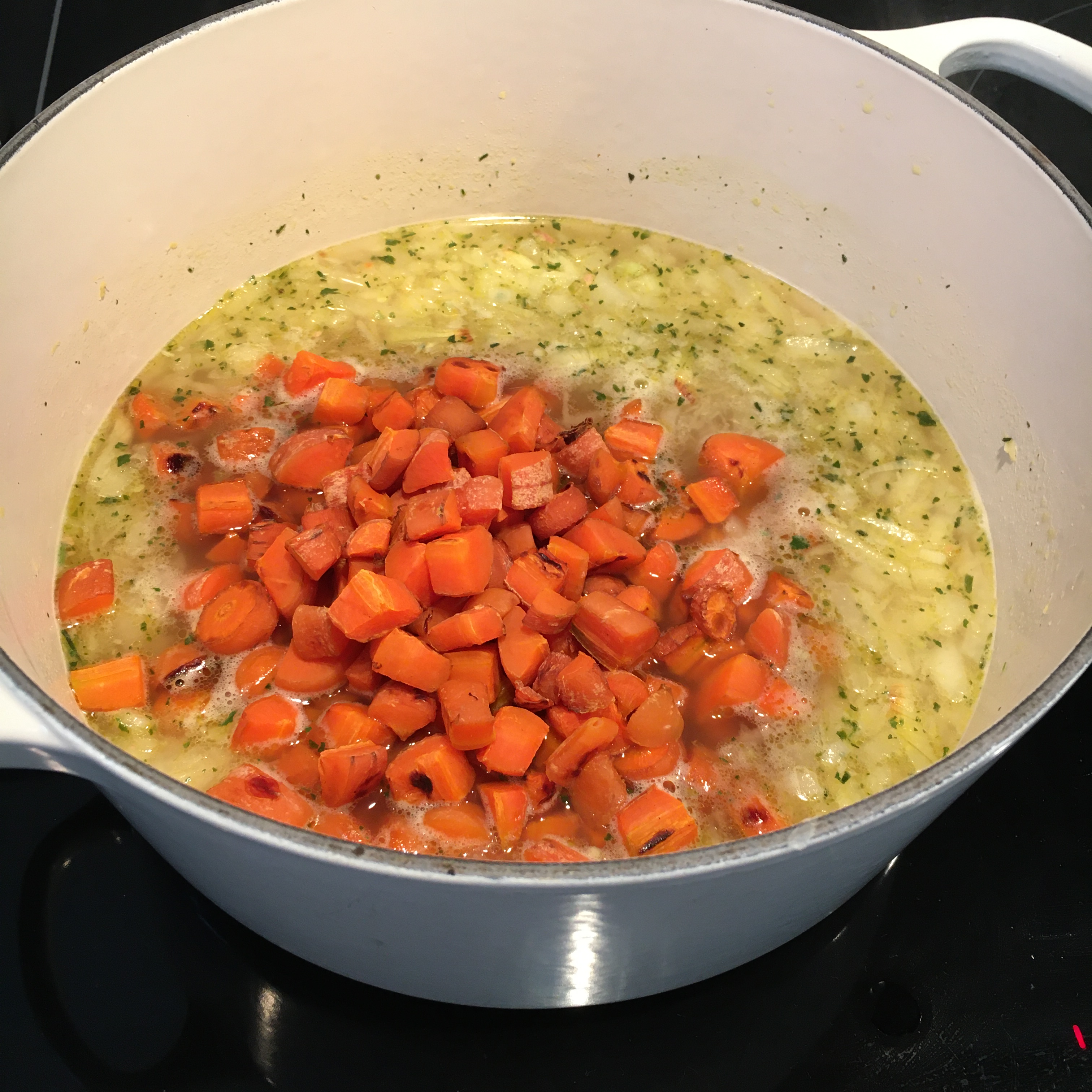 - Når buljongen koker, skru ned varmen på gryta og ha i de stekte gulrotbitene