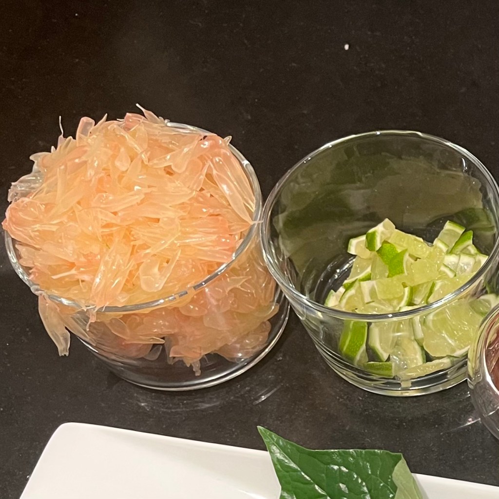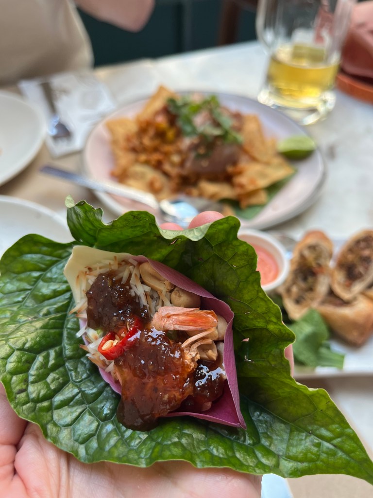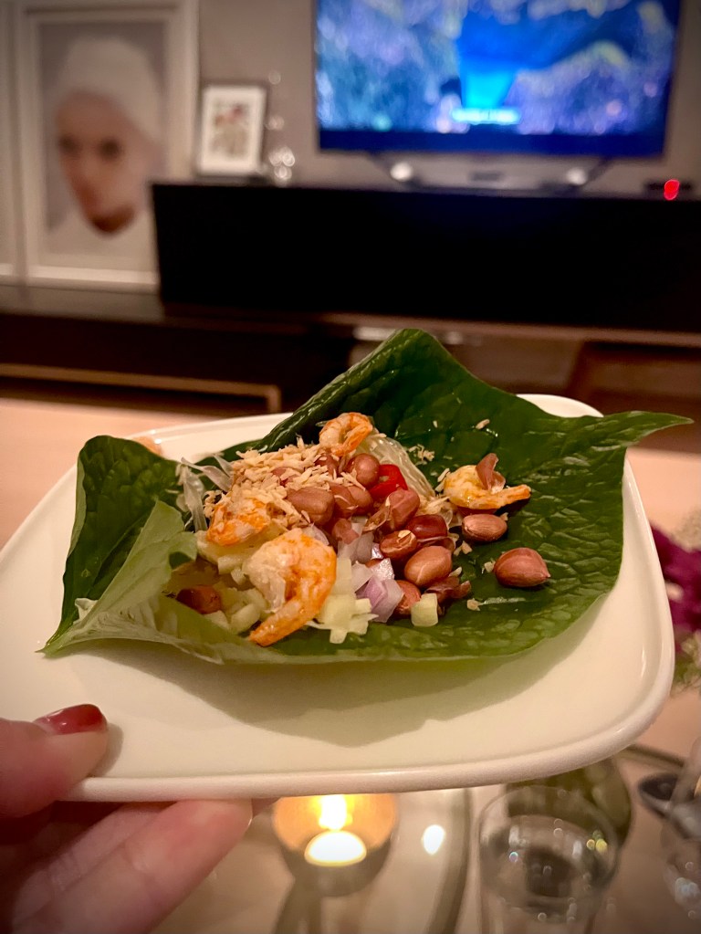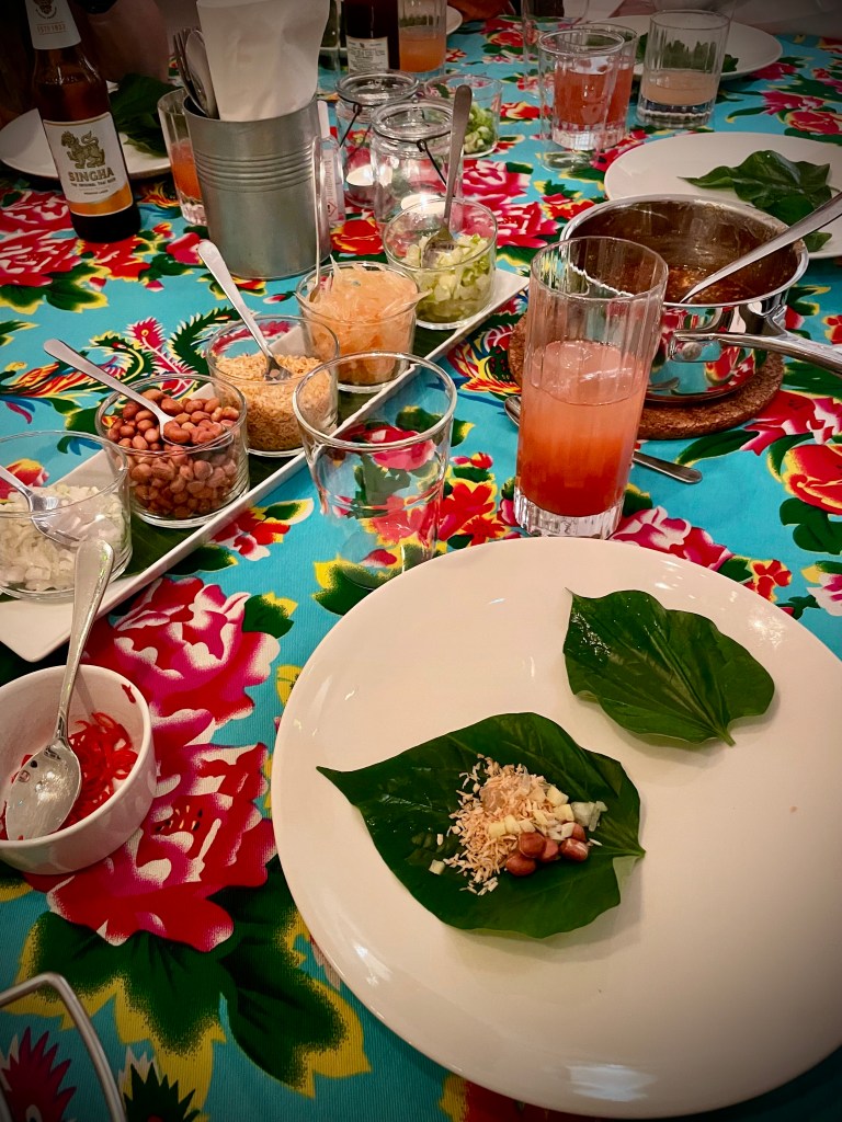 Dette her altså! Vi bestilte lunsj på måfå i Bangkok, og plutselig satt vi der og spiste blader med masse greier på og en fantastisk saus. Sausen heter altså Miang Kham og når man ser hvor mye palmesukker som er i, er det ikke rart den er lett å like. Bladene heter Cha Plu, og de fylles med litt av alt føles det som. Det mest overraskende var små limebiter med skall, og at det var SÅ godt at skallet var på.