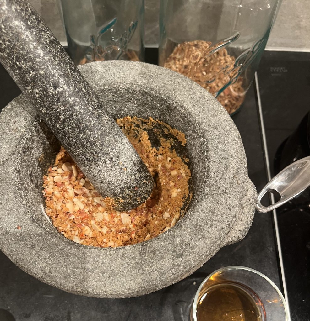 - Ha i ristet kokos og mortre til kokosen er helt knust