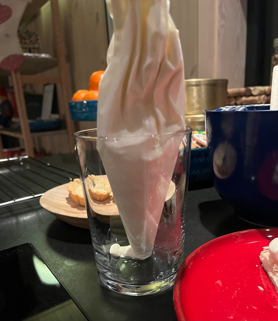 - Ha kremen i en sprøytepose. Sett sprøyteposen i et glass, så blir det mindre kløn for å få kremen oppi.