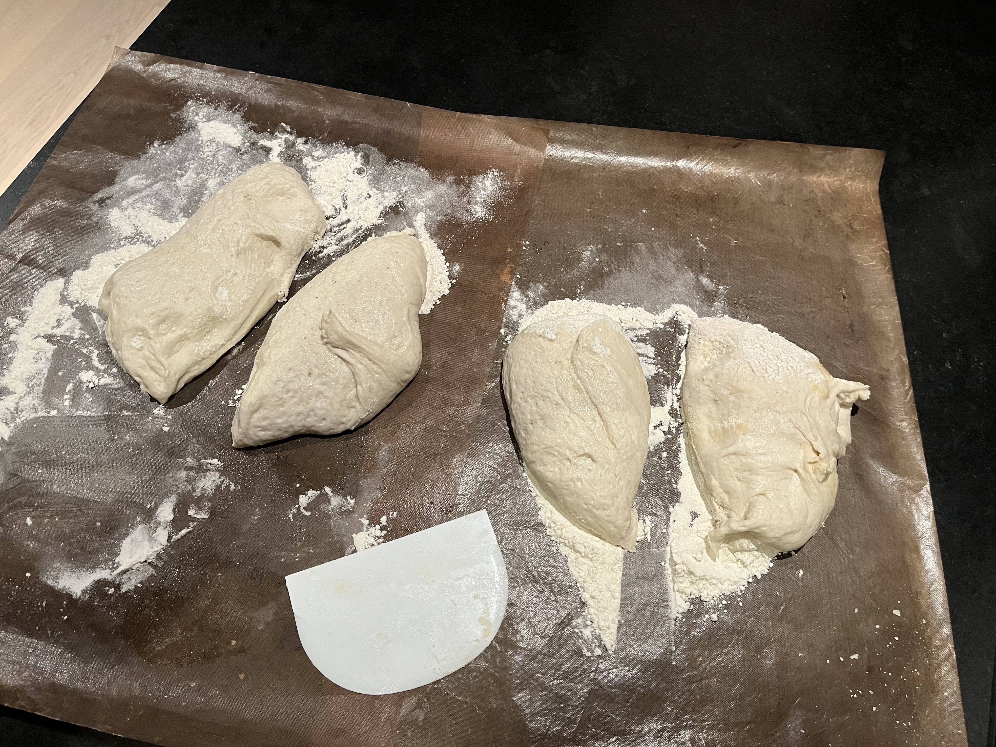 - Del i ca 4 like biter og rull dem som store boller, men ikke kna. All den deilige stratosluften skal få bli. Ha litt mel oppå hver bolle og dekk med plastfolie