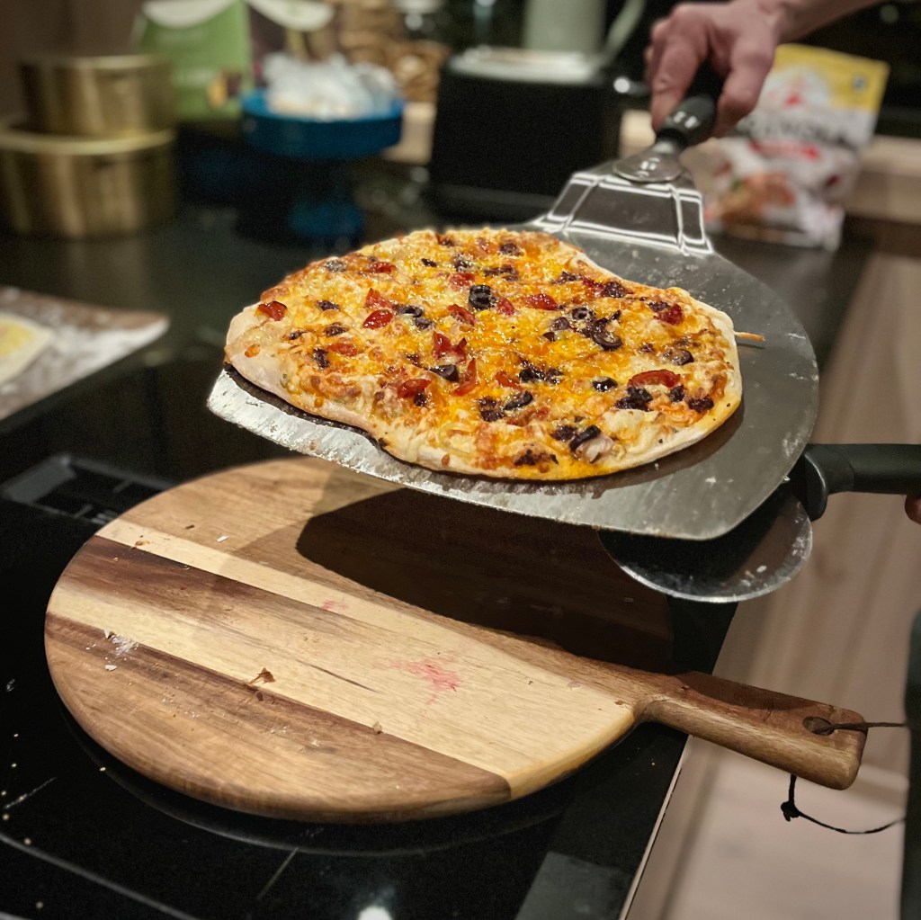 - Bruk en pizzaspade og plasser bakearket med ferdigpyntet pizza på pizzastenen