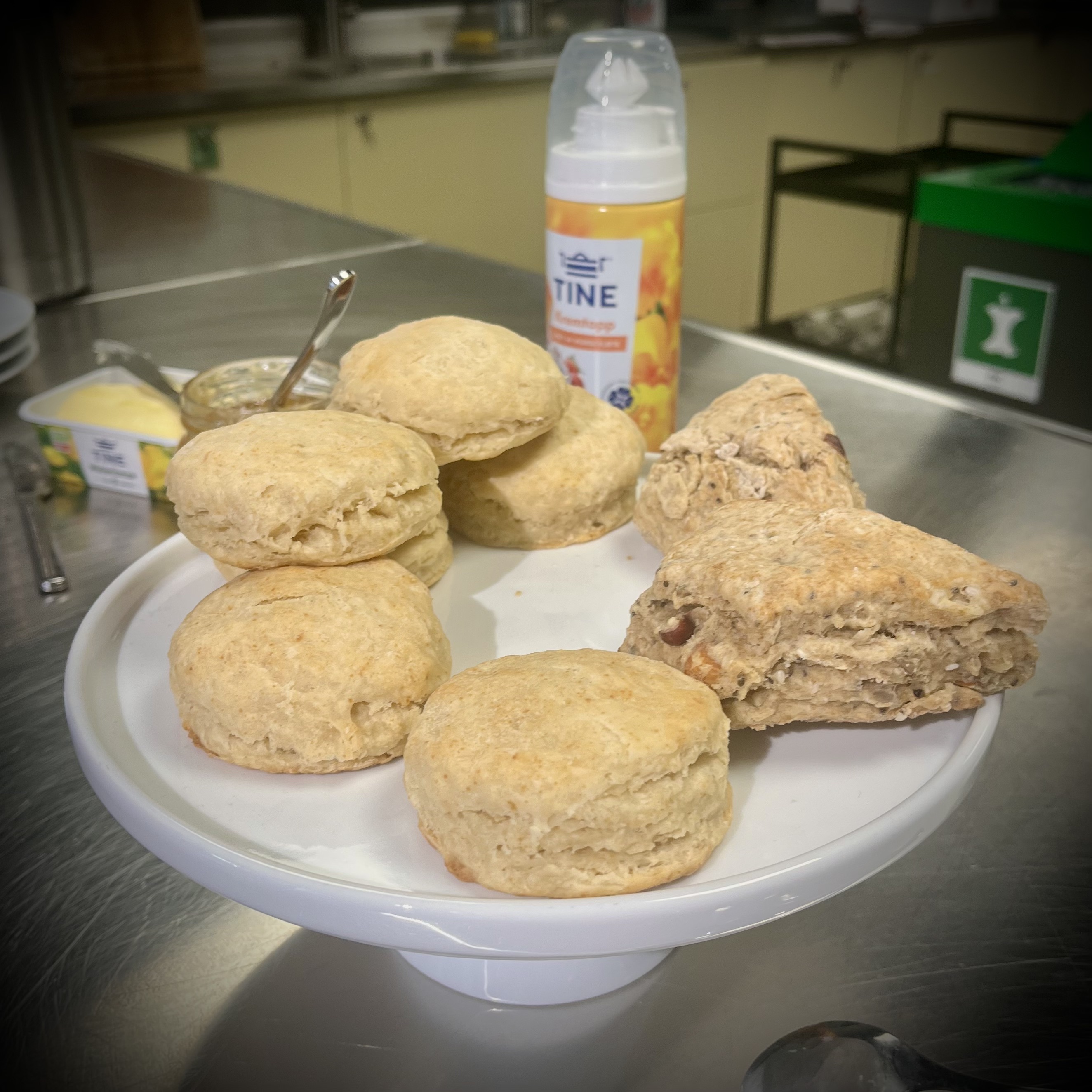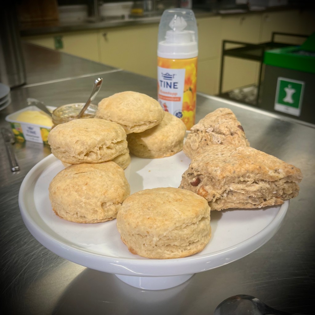 - Legg sconesene på bakepapir på et stekebrett, og stek i 15-17 minutter, til til er lett gyldne og hule når du banker på toppen.