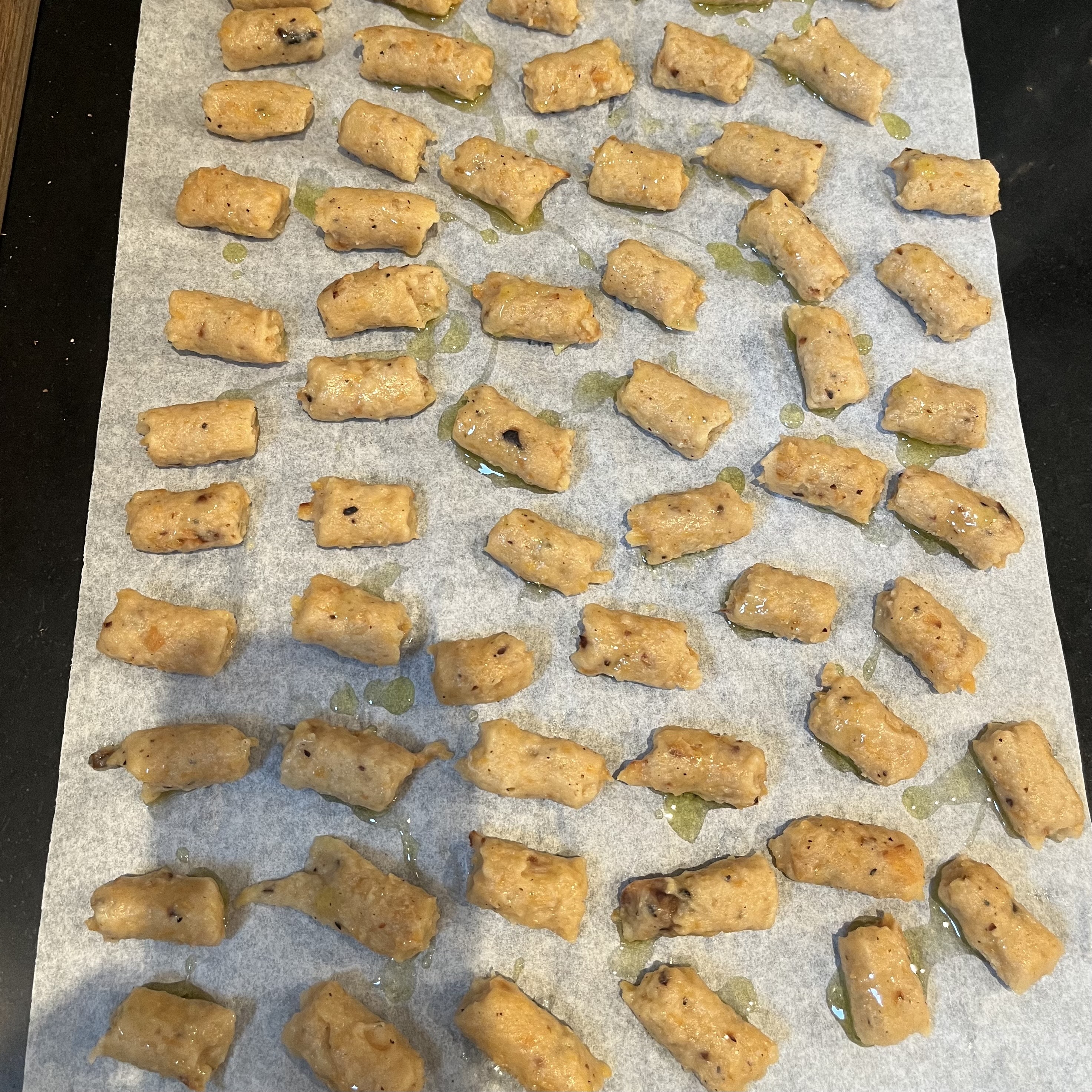 - Når all gnocchien er kokt: risle over 1 ts olje og avkjøl i 20 minutter. Dette gjør at de lettere holder fasongen når du steker dem