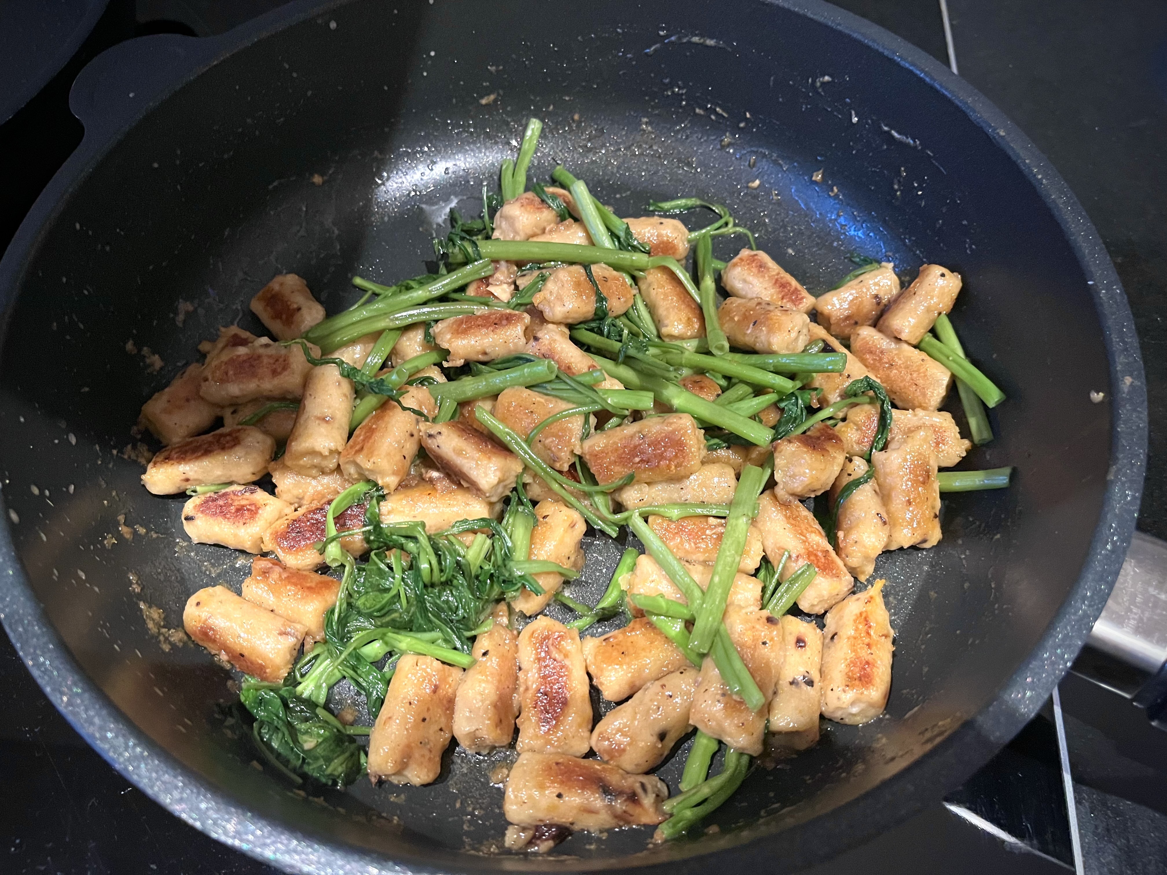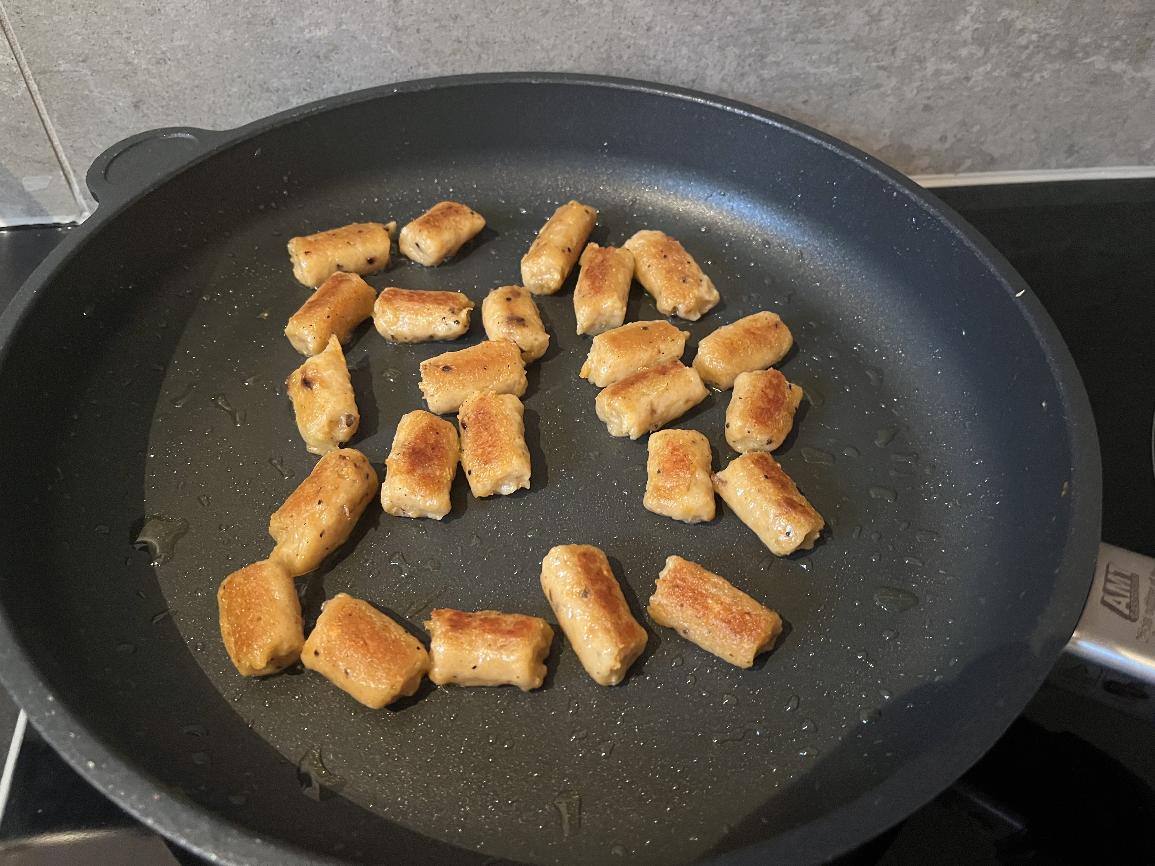 - Når pannen er veldig varm, stek gnocchiene i 1-2 minutter