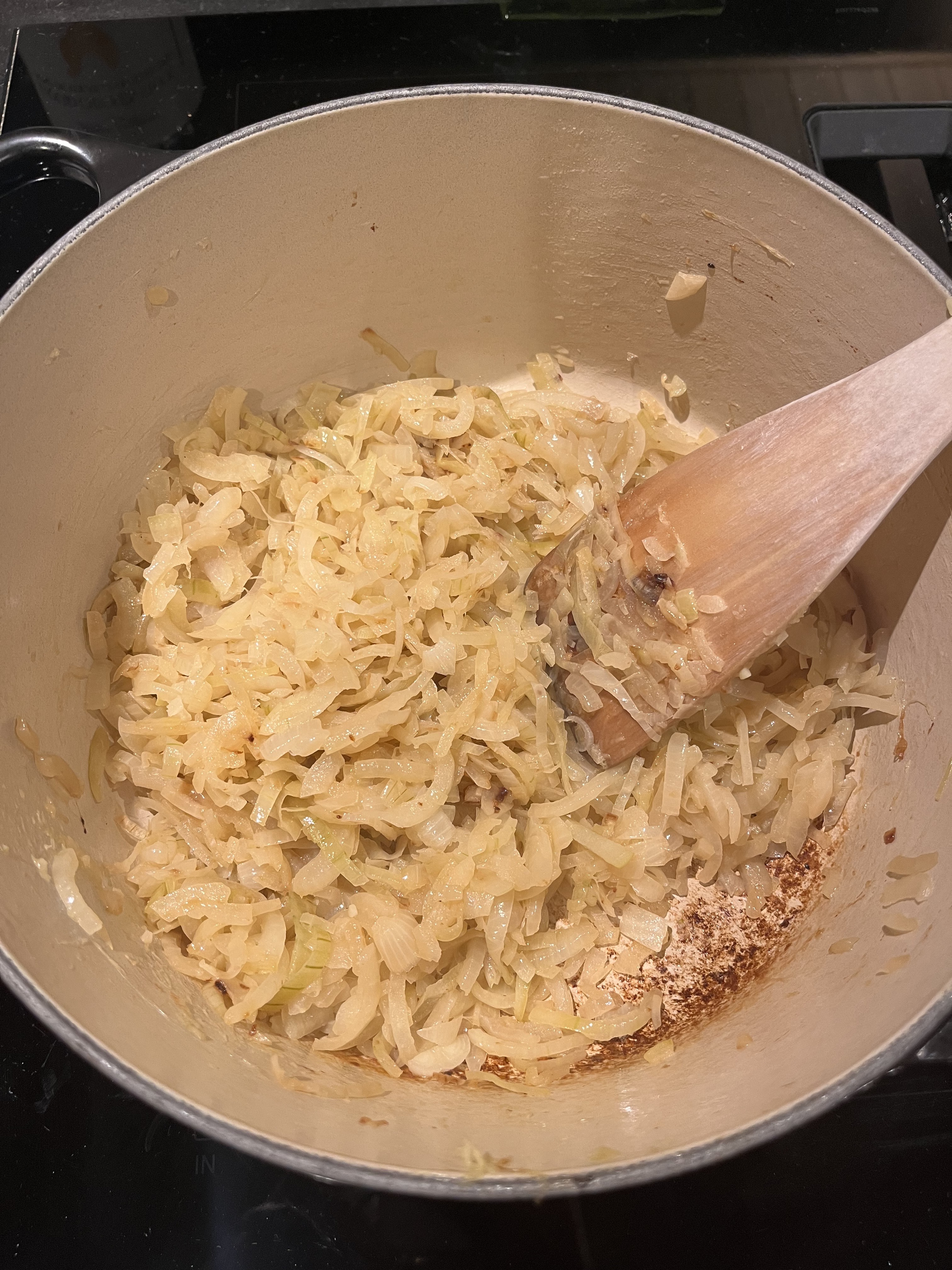 - Smelt smøret i en jerngryte og la løken surre på lav varme i 40–50 minutter til løken er gyllenbrun og karamellisert. Det setter seg en del brunt i bunnen av gryta, men dette løsner senere og bidrar bare til god smak.