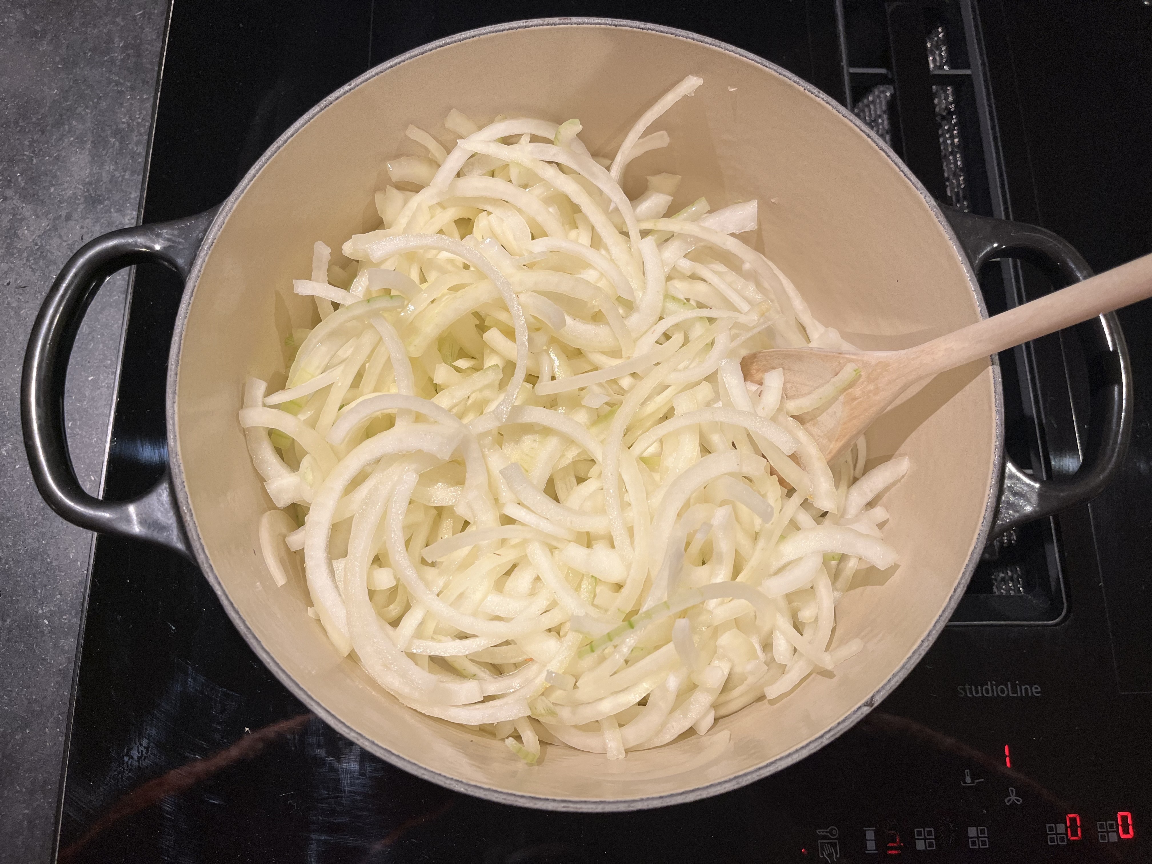- Rens løken, del i to og skjær i tynne skiver.
