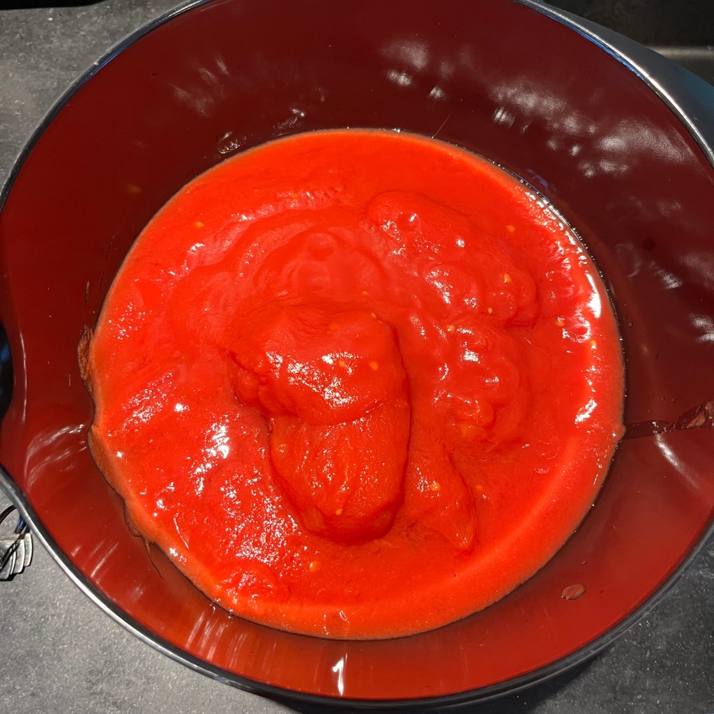 - Hell tomatene og tomatvæsken i en bolle og kjør lett med en stavmikser til du får en ganske rennende tomatsaus