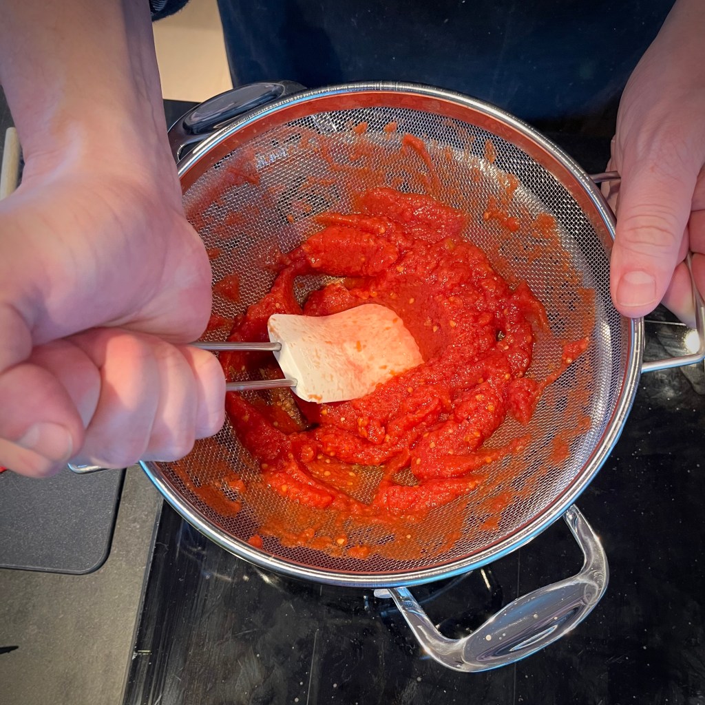 - Hell tomatsausen igjennom en sil så sausen havner i en kjele. Press tomatene så det bare er tomatkjøttet igjen i silen. Ta vare på tomatkjøttet til etterpå.