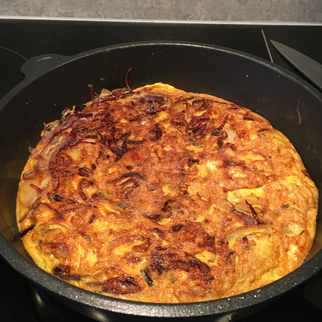 En ting jeg digger med tapas er at man kan kjøpe godt brød, skinke, olje og oliven og være i mål. Denne sykt gode og saftige potet-tortillaen er sånn sett et bonustrack. Den tar ca en time å lage, men den står den mye alene og klarer seg selv, og byr på et underholdende C-moment når den skal snus!
