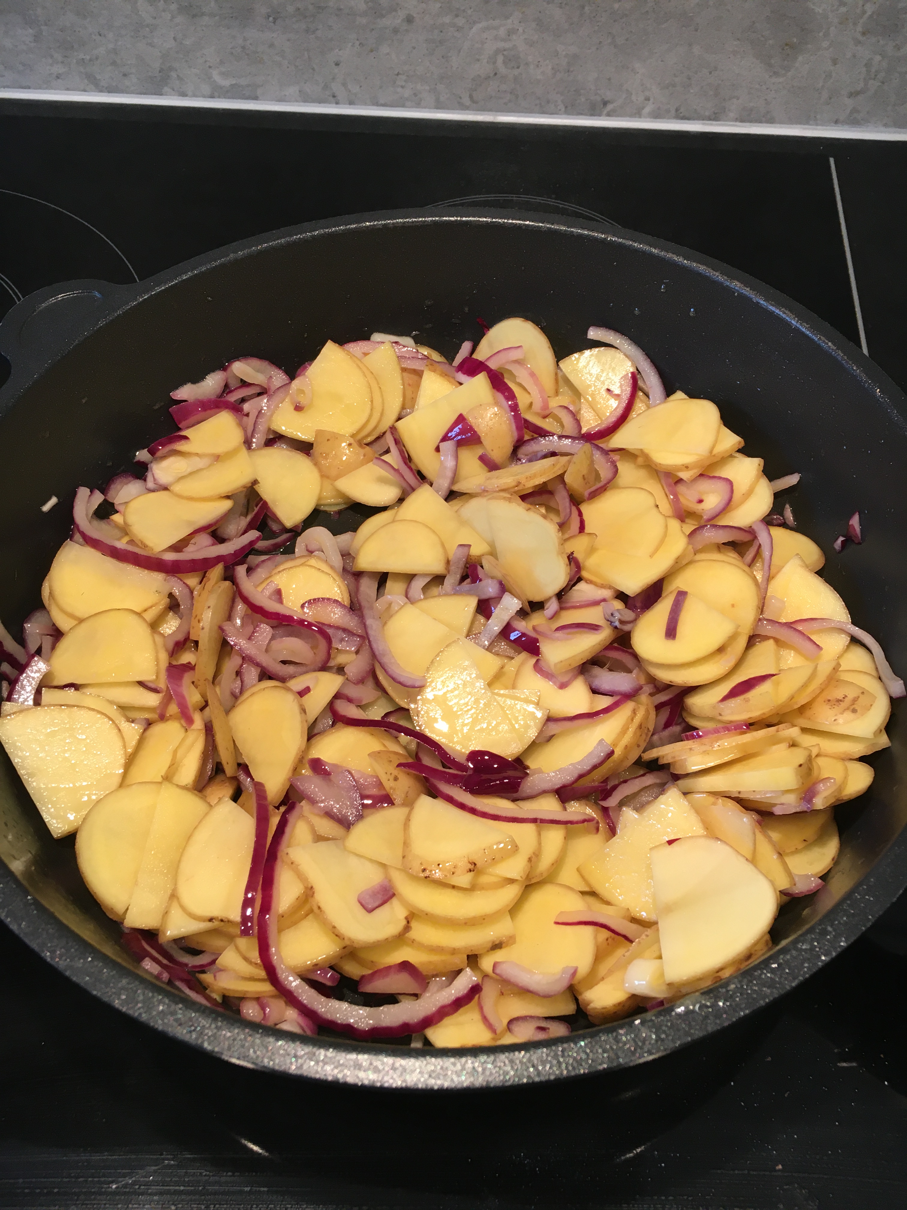 - Når løken har surret i sine 15 minutter, ha i potetskivene, ha på lokk og stek i 15-20 minutter, til potetskivene er myke